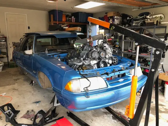 At the heart of the build is a first-generation Coyote 5.0L swapped into the Fox Body chassis. Managed by a Ford Racing control pack, the setup delivers roughly 400 horsepower to the rear wheels. Supporting components include a Tremec T56 six-speed transmission, SPEC Stage 4 clutch, Boundary oil pump gears, and a Ford Racing limited-slip differential. The engine breathes through a custom cold air intake, BBK headers, 2018 Mustang intake manifold, and a custom X-pipe with Borla Pro XS mufflers to keep it compliant with sound regulations.