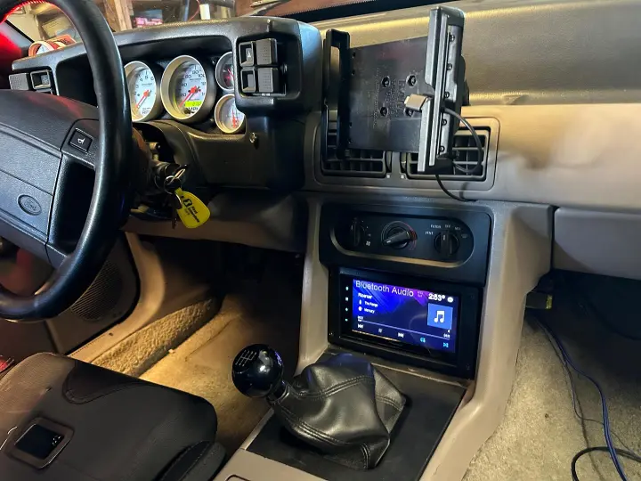 For data and driver feedback, Chris uses a RaceCapture MK2 paired with a tablet display for live telemetry and lap timing. The system is mounted securely with RAM mounts for on-track durability. A Double-DIN Apple CarPlay head unit and 12-inch subwoofer powered by a Pioneer 700W amp make sure the car lives up to its “ultimate street car” title on and off the track.