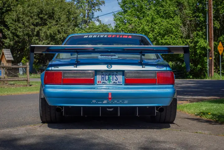 The exterior is a striking combination of classic and competition. Custom-blended Chicane23 fender flares, paint-matched to the original Bimini Blue, give the Fox its muscular stance. Aerodynamic components include a 9 Lives Racing swan-neck rear wing, Carter Customs splitter, side splitters, and rear diffuser, and a Chicane23 carbon fiber hood with a custom tint from K.C. Kuhnhausen Metal Concepts.