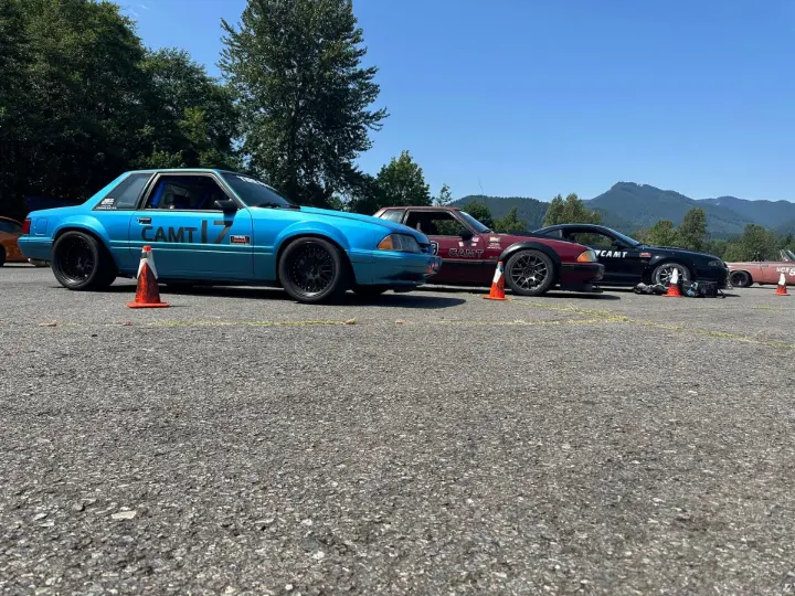 Braking is handled by S550 four-piston Brembos up front and 2004 Cobra rear calipers, with G-Loc R8 pads providing the necessary bite. An MK60 ABS system, wired with the help of Racing Harness Tech, brings modern safety and control — especially valuable in the cold, wet Pacific Northwest where Chris competes most often.