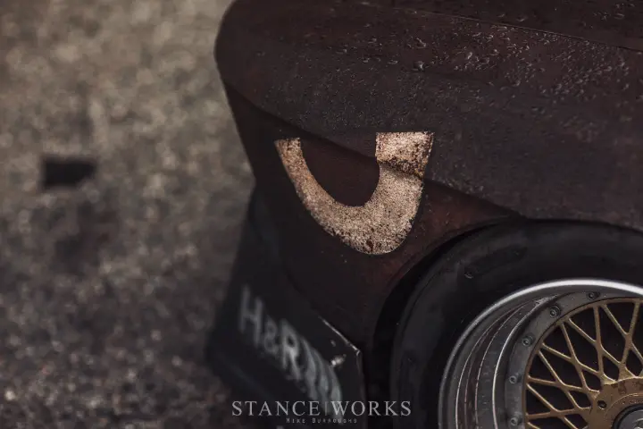 Rusty Slammington first gained attention for embracing its decay. Rather than hiding corrosion under paint, the build leaned into it — celebrating scars, wear, and age as part of the car’s identity. Slammed aggressively and dripping with character, the early versions were unapologetically different.